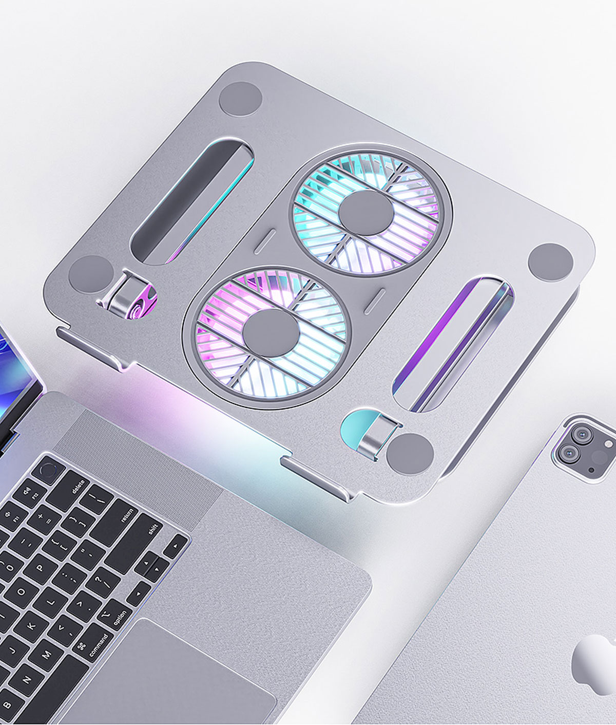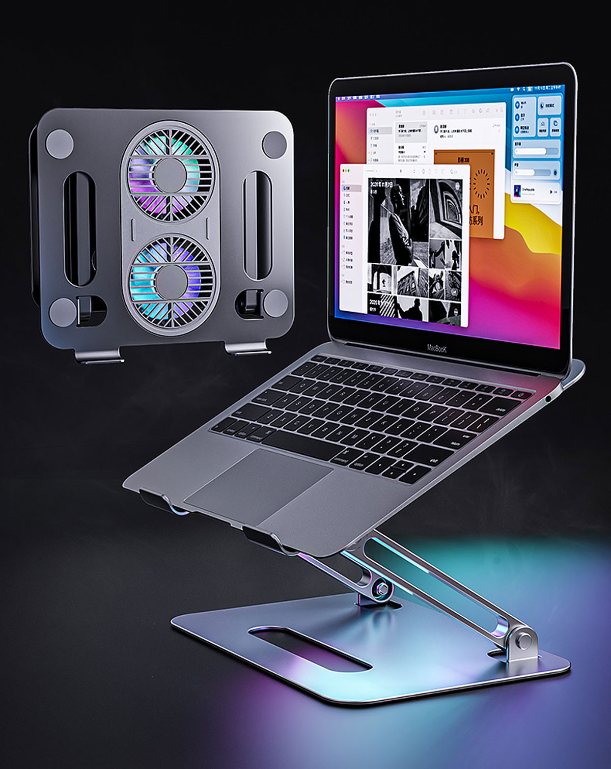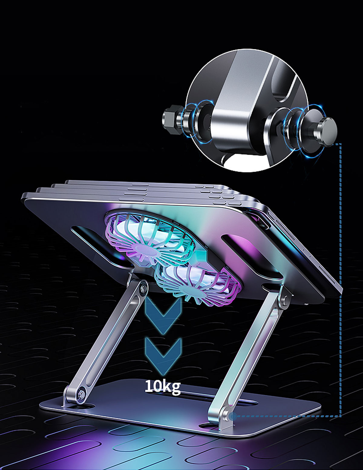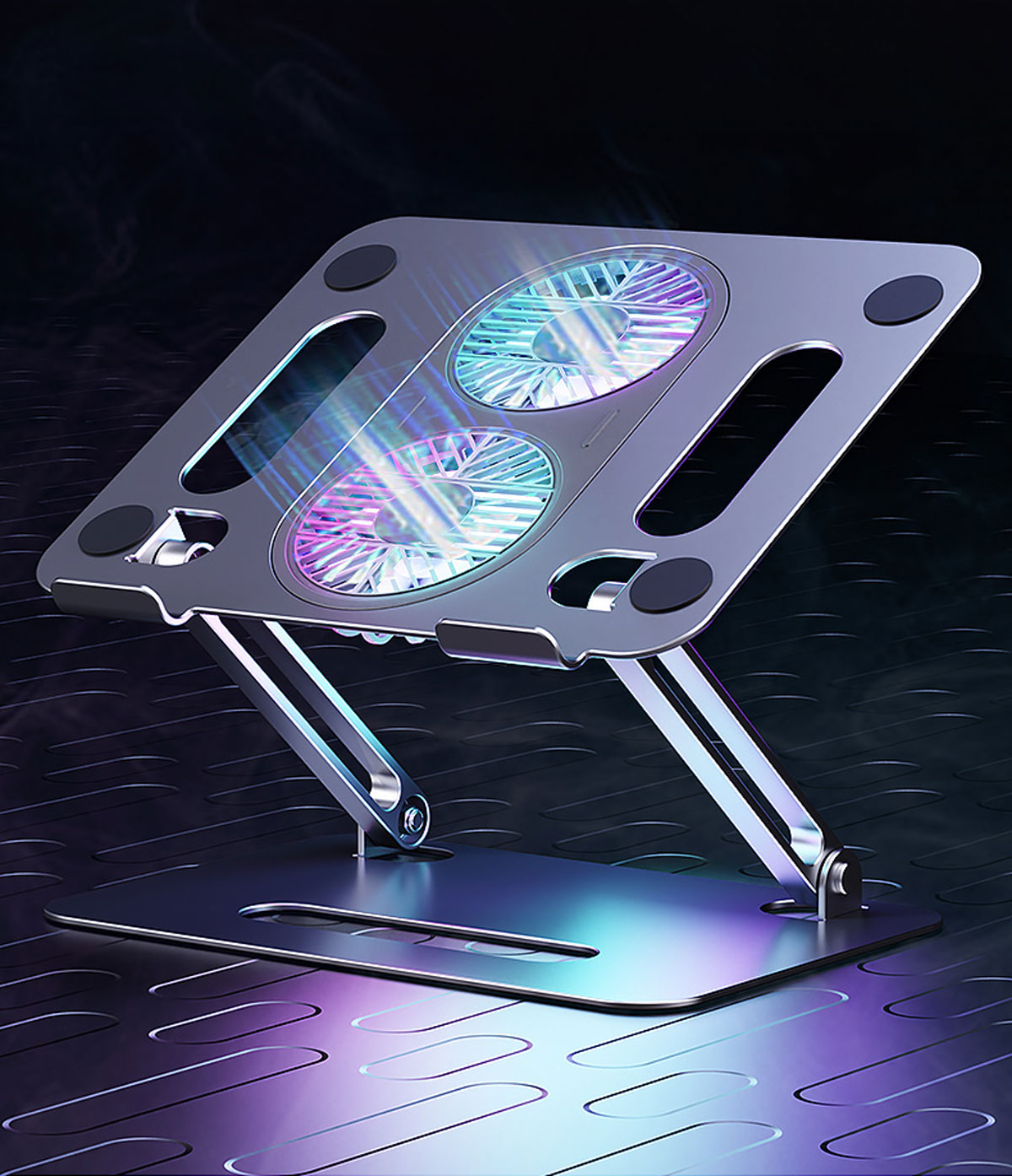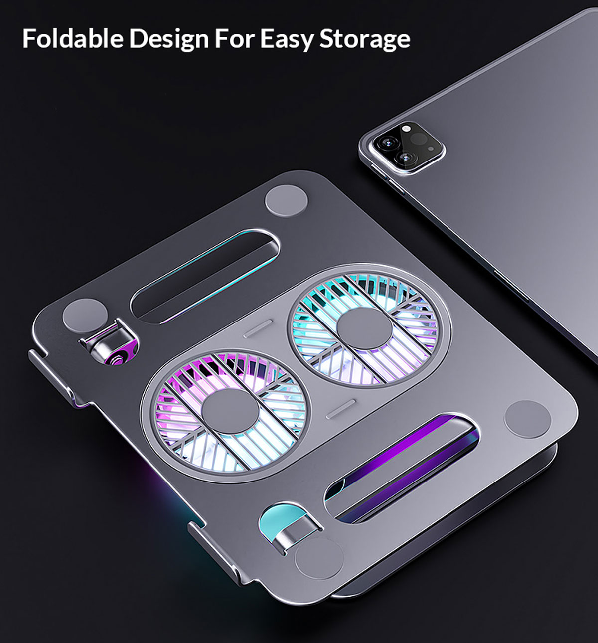 Anodizing Process Does Not Rust 2.55MM Thicken Aluminium Alloy | Quiet Oversized Dual Cooling Fans | Height Adjustable From 3-27cm (1.18-11 Inch) | Adjustable Damping, Stable Without Shaking | Soft Silicone Pad To Protect From Scratches | Foldable Design